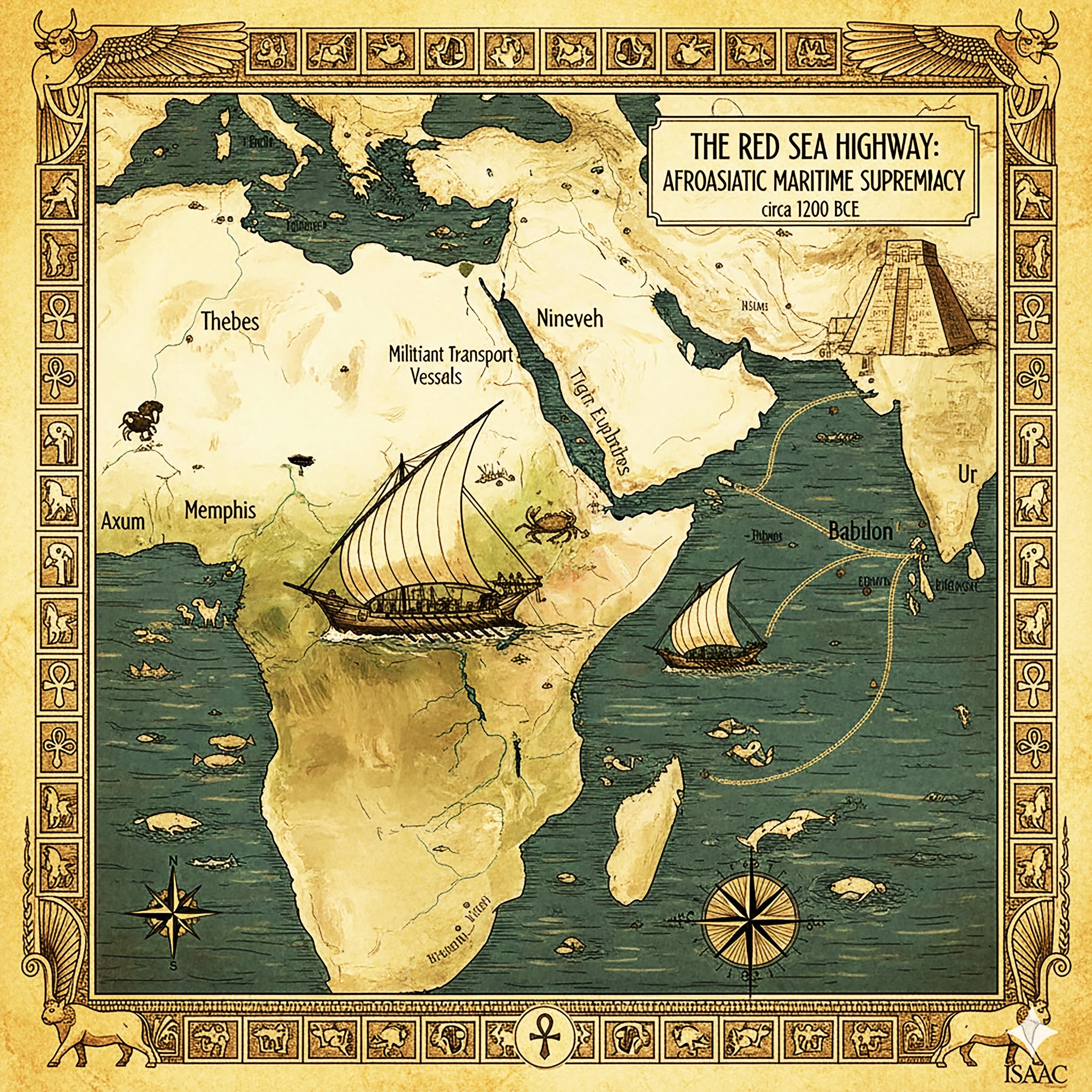 —specifically the reliefs showing Ninevites sailing alongside depictions of monkeys, crabs, and maritime life—provides a powerful visual record of the Red Sea acting as a direct corridor between Mesopotamia and Africa.